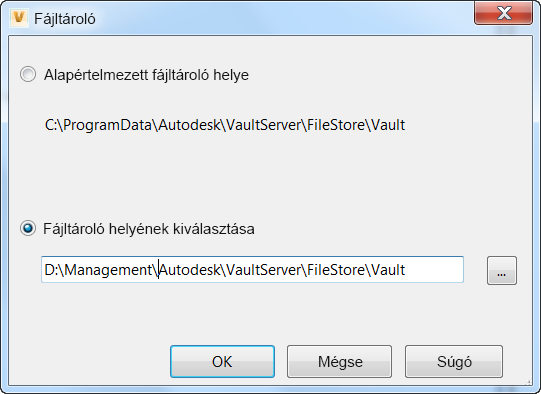 A Fájltároló párbeszédpanelen engedélyezheti egy vagy több Vault fiók számára az Autodesk Data Management Server helyett a File Server használatát a fájltároló frissítéséhez.