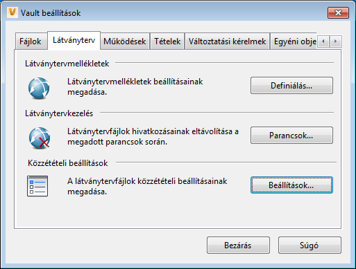 A Vault beállítások párbeszédpanel Látványtervek lapján konfigurálhatja a látványtervmellékleteket, kezelheti a látványtervfájlokat, valamint megadhatja a közzétevői beállításokat.