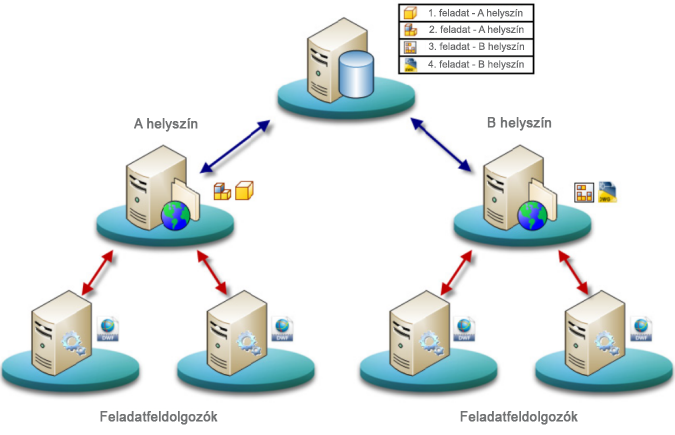 A Feladatszerver támogatja a többhelyes környezeteket egy adott szerverre bejelentkezéssel és csak az adott szerverhez hozzárendelt feladatok feldolgozásával. Az alábbi ábrán bármely B helyre bejelentkező Job Processor kizárólag a B helyen lévő feladatokat dolgozza fel. Ugyanez történik az A hely Job Processor alkalmazásaival.