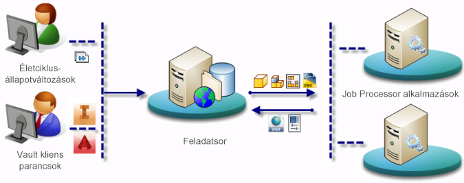 - Job Processor – egy különálló alkalmazás, amely lefoglalja a sorban álló munkákat és lehúzza azokat a feladatszerverről feldolgozásra. Mivel a Job Processor a Vault klienssel települ, bármely Autodesk Vault Workgroup and Professional alkalmazással rendelkező munkaállomás használható a feladatok feldolgozására.