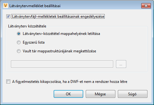 A Látványtervmelléklet beállításai párbeszédpanelen engedélyezheti vagy letilthatja a fájlmellékleteket, megadhatja, hogy hol kerüljenek közzétételre a látványtervmellékletek és letilthatja vagy engedélyezheti a DWF-figyelmeztetéseket.