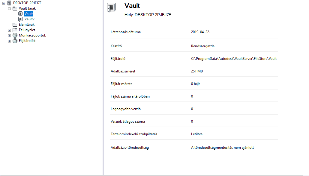 A kiválasztott Vault tár összefoglalója megjelenik. A statisztika a következőket tartalmazza:
