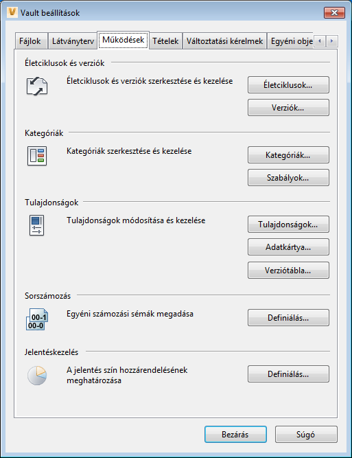 A Viselkedések lap a Vault beállítások párbeszédpanelen tartalmazza az életciklus-definíciók szerkesztéséhez, revíziók kezeléséhez, kategóriák és szabályok felügyeletéhez, tulajdonságok létrehozásához és módosításához, egyéni számozási sémák módosításához és a jelentések színeinek beállításához szükséges opciókat.