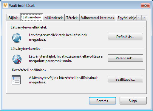 A Vault beállítások párbeszédpanel Látványtervezés lapon konfigurálhatók a látványtervmellékletek és közzétételi beállításaik, valamint kezelhetők a látványtervfájlok.