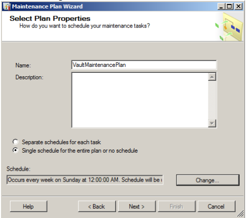- A Tervezet tulajdonságainak kiválasztása párbeszédpanelen írja be névhez, hogy Vault Maintenance Plan követés, majd kattintson a Módosítás gombra az ütemezés beállításához.