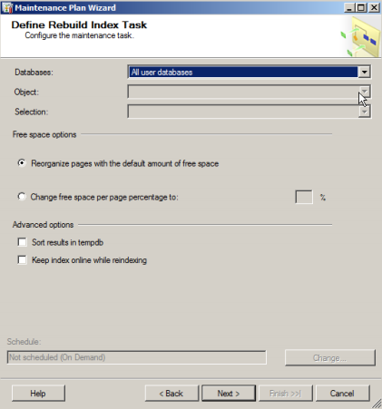 - Az Újraépítési index feladat meghatározása párbeszédpanelen válassza az Összes felhasználói adatbázis lehetőséget a legördülő listából.