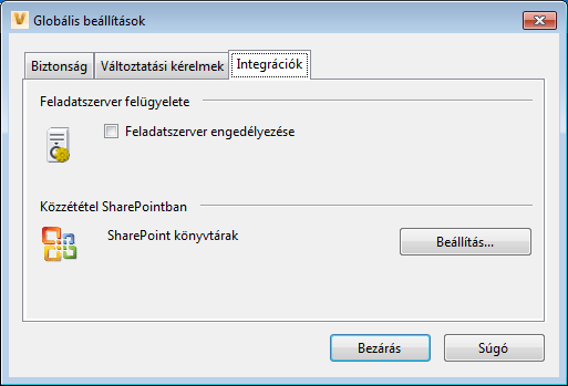 A Globális beállítások párbeszédpanel Integrációk lapján engedélyezheti a Job Server alkalmazást, és megadhatja a SharePoint könyvtárakba történő közzététel beállításait.