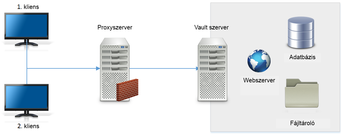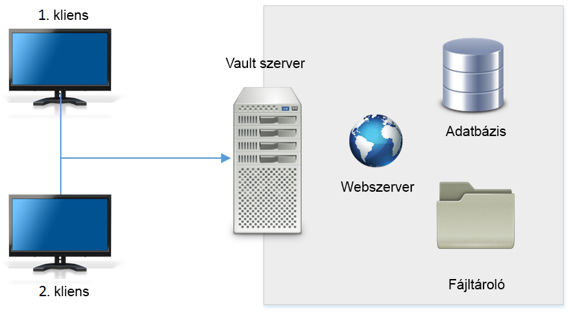 Három fő elemből áll a Vault szerver: egy webszerverből, egy adatbázisból, és egy fájltárolóból. A következő ábra az összetevők alapvető konfigurációját illusztrálja.