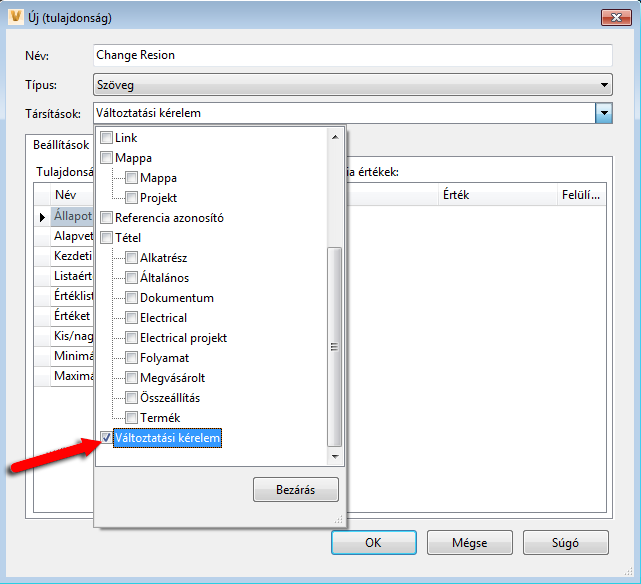 Változtatási kérelmek tulajdonságainak létrehozása