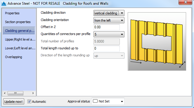 | Cladding orientation | Selects the cladding orientation. From the top or from the bottom (for a horizontal cladding) From the left or from the right (for a vertical cladding). |