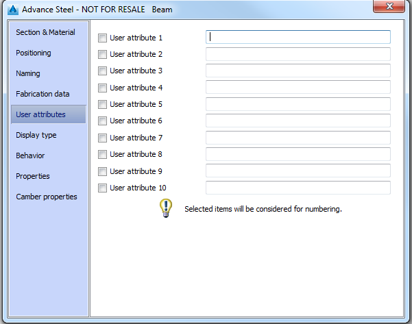 On this tab of the beam properties dialog box you can define up to ten attributes that can be taken into account at numbering.