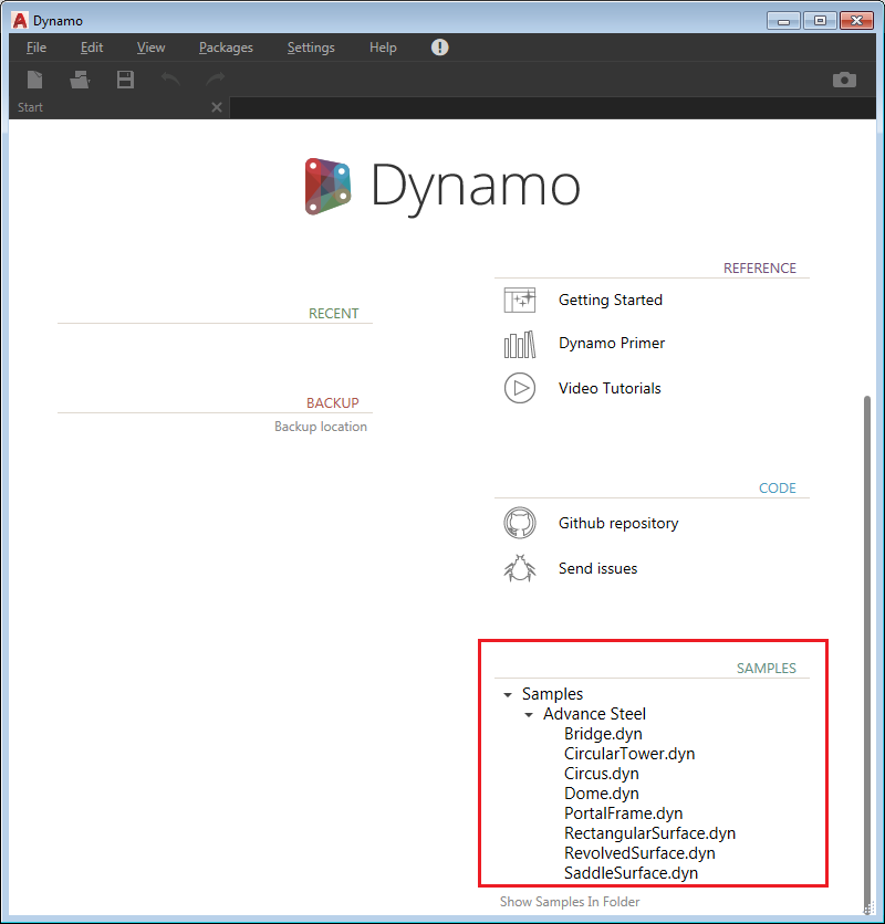 The sample files for Advance Steel are located on the Dynamo start page, SAMPLES section: