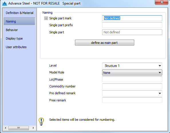 The model role is considered, for example, in the drawing creation to assign a presentation, dimensioning and labeling style. An object set as a column is dimensioned and labeled differently by the automatic detailing process than an object set as a beam. The model role is used by the prefix tool to assign prefixes but it is not used directly for numbering. |