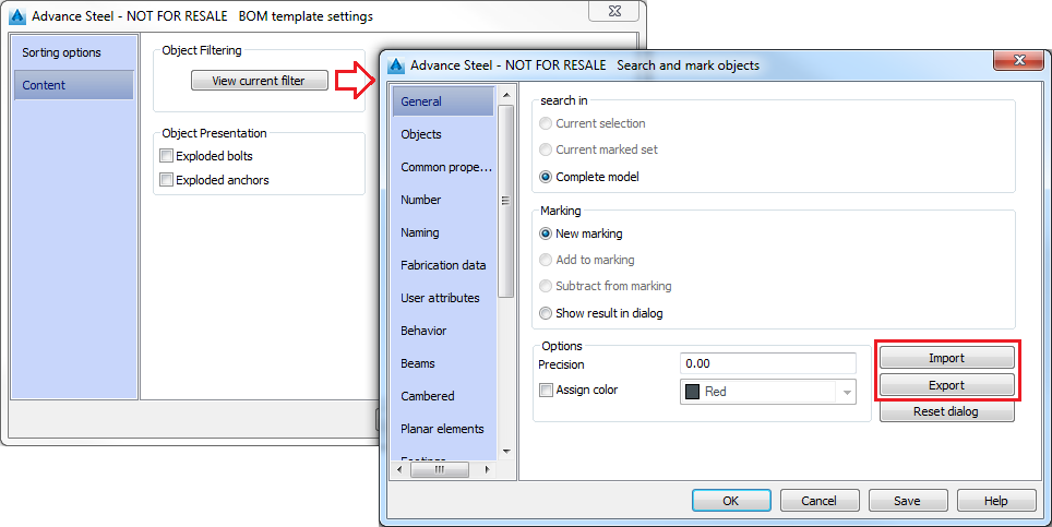 The same import and export procedure also applies to the BOM on drawing template. To open the Search and mark objects dialog, select List sorting and content from the Output tab, BOM on drawing panel.