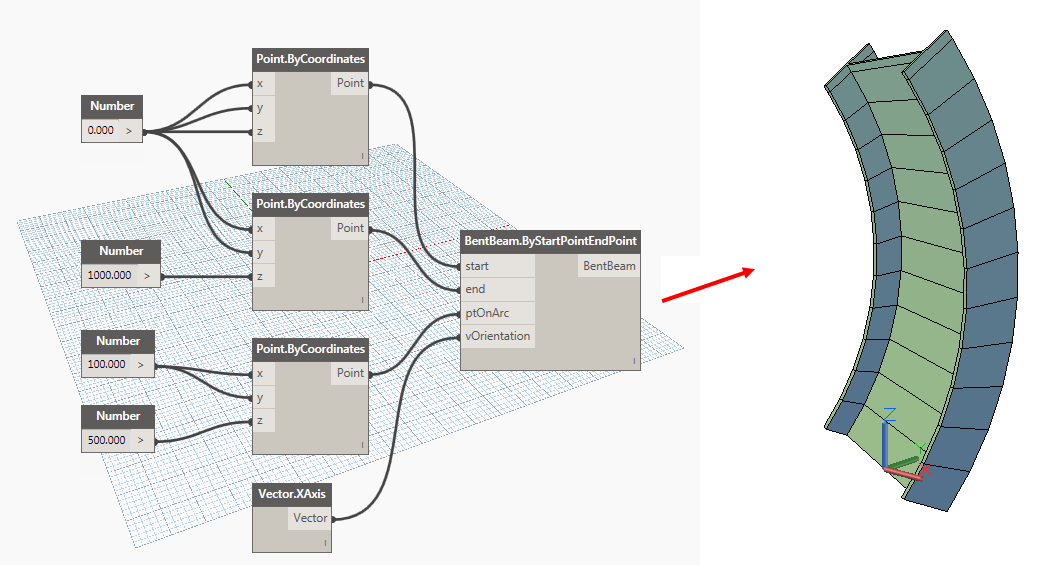 Using a similar procedure as for creating a straight beam in Dynamo, use the following scheme to generate a bent beam in Advance Steel, using the Dynamo extension: