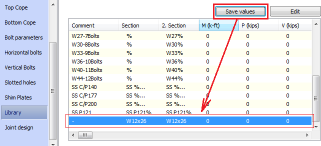 For connections that don't offer any out-of-the-box presets, or the preset is made on a completely new scenario, you can also add lines to the Library using the Save values button. A clear name in the Comment field is advisable for providing enough information during the modeling stage for detailers.