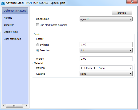 On this tab of the properties dialog box you can define the weight, the material and the insertion scale factor for special parts.