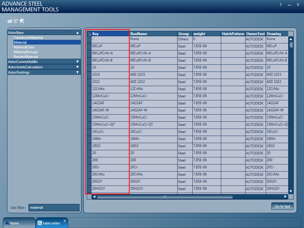 Settings panel. In the Management Tools application, access the Table Editor, click the button in the top right corner (Open ODBC) to load the Advance Steel databases and use the filter in the bottom right to search for "material". Access the Material table under AstorBase to see the material keys: