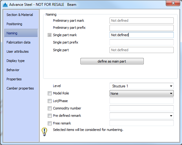 The model role is considered, for example, in the drawing creation to assign a presentation, dimensioning and labeling style. An object set as a column is dimensioned and labeled differently by the automatic detailing process than an object set as a beam. The model role is used by the prefix tool to assign prefixes but it is not used directly for numbering. |