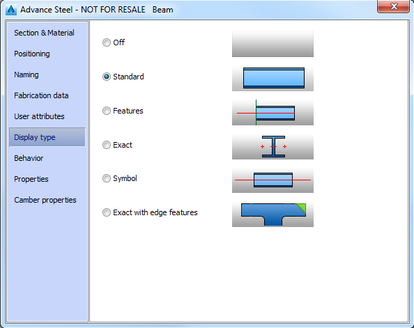 On this tab of the beam properties dialog box, you can select the beam representation type in the model.