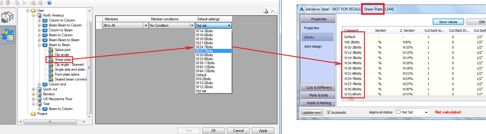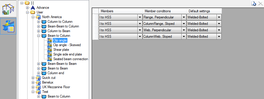 For example : If a connection rule is made for Beam-Beam, I to I beam, Web of main member to create a shear plate, then the default settings can accept a rule saying the same Beam-Beam, Shear plate connection, I to I beam, Web - Sloped&Skewed. In addition to this, a second rule can be added for Web-Perpendicular, matching the same connection rule mentioned above - so for one connection rule that ensures the creation of a shear plate when two beams are connected, two default settings lines can be configured to use different library settings for perpendicular and sloped&skewed situations.