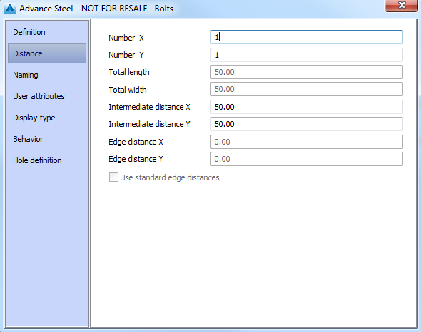 | Use standard edge distances check box | Optionally, you can use the standard edge distances. The values are set according to the selected bolt type. |