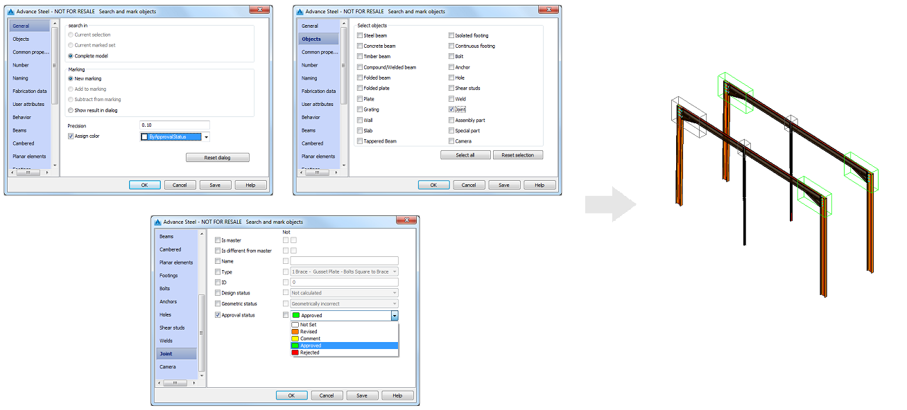 Note: You can add custom approval status entries, using the Management Tools. These new entries become available for use in Advance Steel models, in: