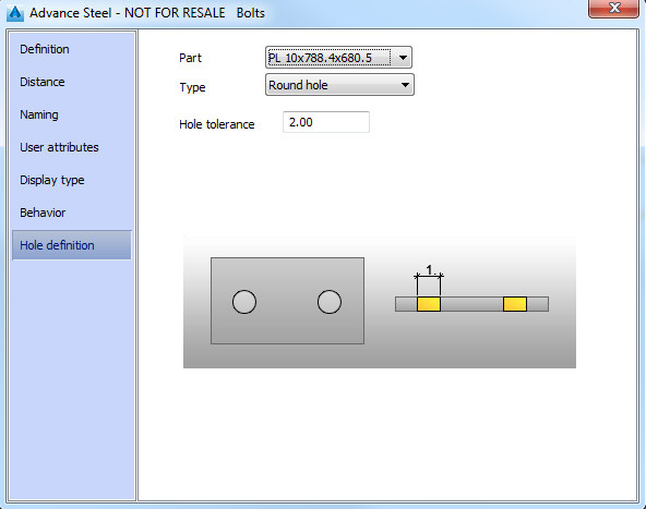 On this tab of the properties dialog box, you can select the type of hole created for the bolts. The parameters change according to the selected hole type.