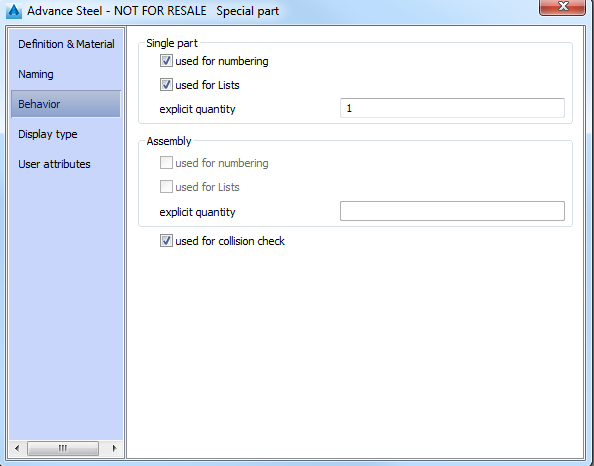 On this tab of the properties dialog box you can set the behavior of elements at collision check and the behavior for single parts and assemblies.