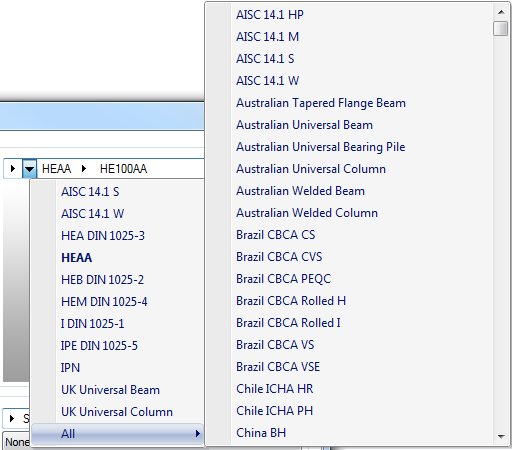 Allows you to select the beam section class, section type and size from the drop-down list displayed by clicking the corresponding arrow