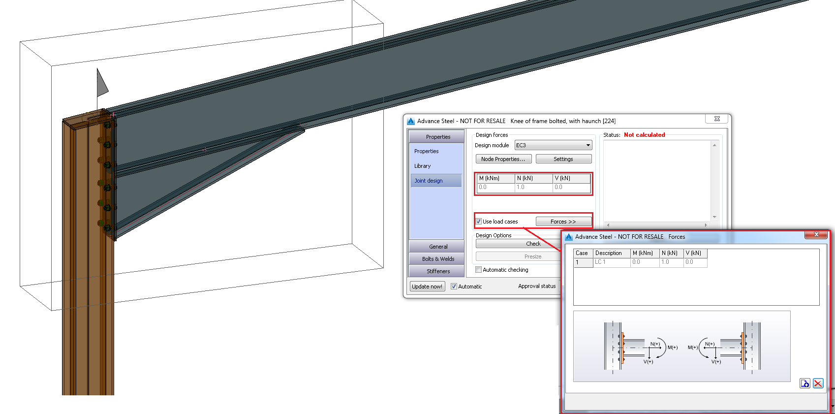 When placing a steel connection between elements that are inside an analytical node, you are able to import the force and moment values inside the Joint Design dialog and run the calculus using those values.