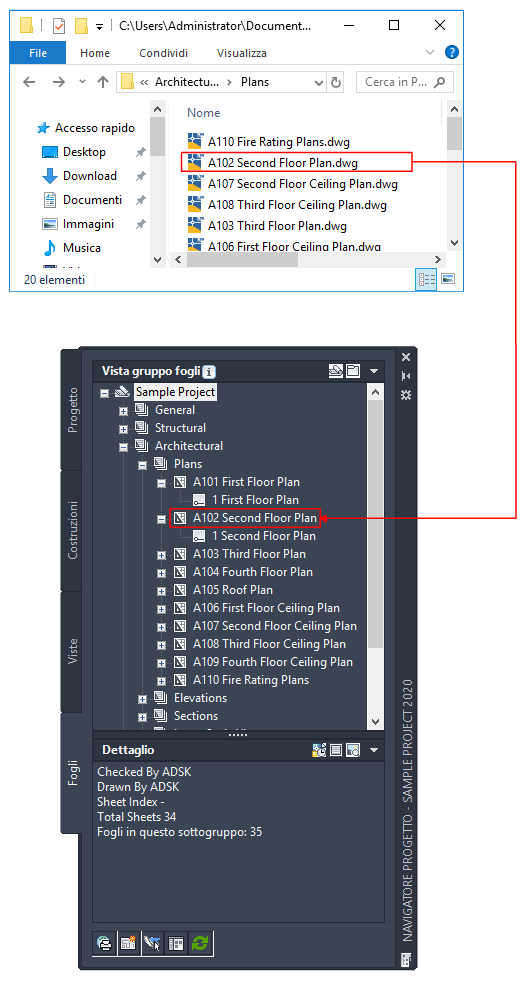 - Trascinare la cartella sulla vista struttura dei disegni della scheda selezionata nel Navigatore progetto.