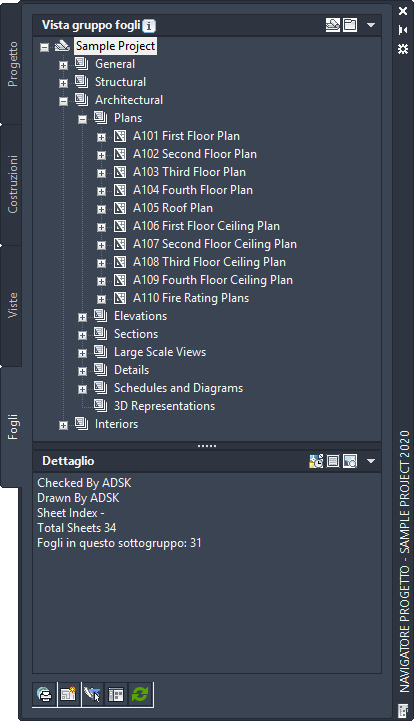 Quando si crea un nuovo progetto, viene creato un gruppo di fogli di progetto univoco che viene visualizzato nella scheda Fogli del Navigatore progetto.
