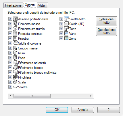 - Fare clic sulla scheda Oggetti e selezionare gli oggetti da includere nel file IFC.