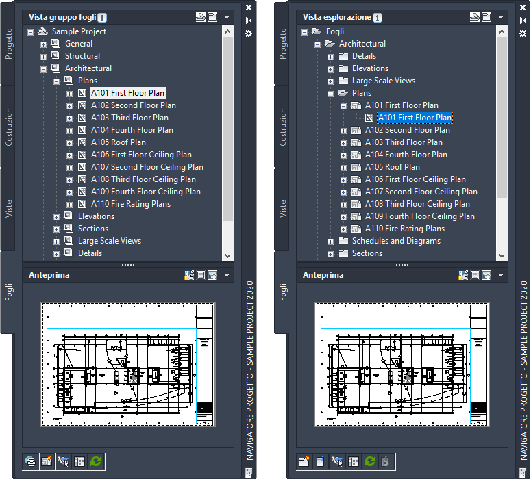 Scheda Fogli con Vista gruppo fogli del progetto, a sinistra, e Vista esplorazione, a destra