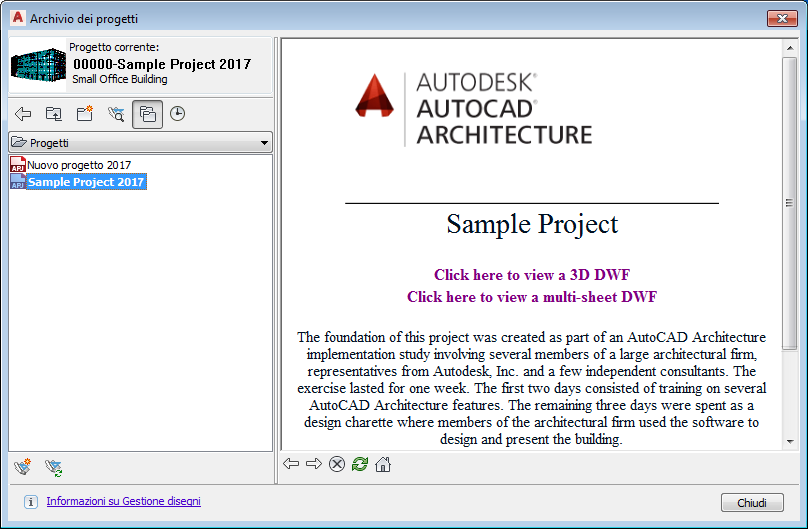 Nell'Archivio dei progetti è possibile creare nuovi progetti, configurare le impostazioni del progetto e gli standard di progetto, aggiungere informazioni di dettaglio e selezionare il progetto corrente. Se un progetto viene impostato come corrente scegliendo l'apposito comando dal menu di scelta rapida o facendo doppio clic sul nome del file, il progetto viene convertito in un formato compatibile con la versione di AutoCAD Architecture toolset utilizzata. Se si aggiornano i percorsi del progetto, tutti i disegni del progetto vengono migrati e non sarà più possibile aprire il progetto in versioni precedenti del software.