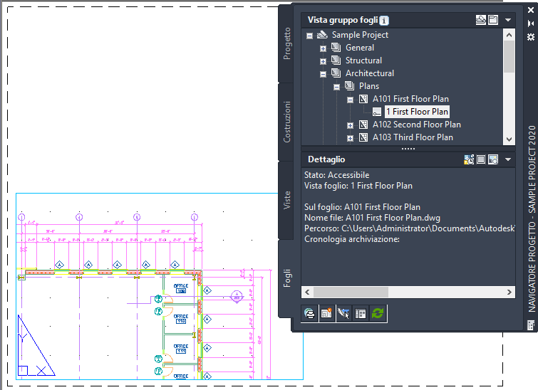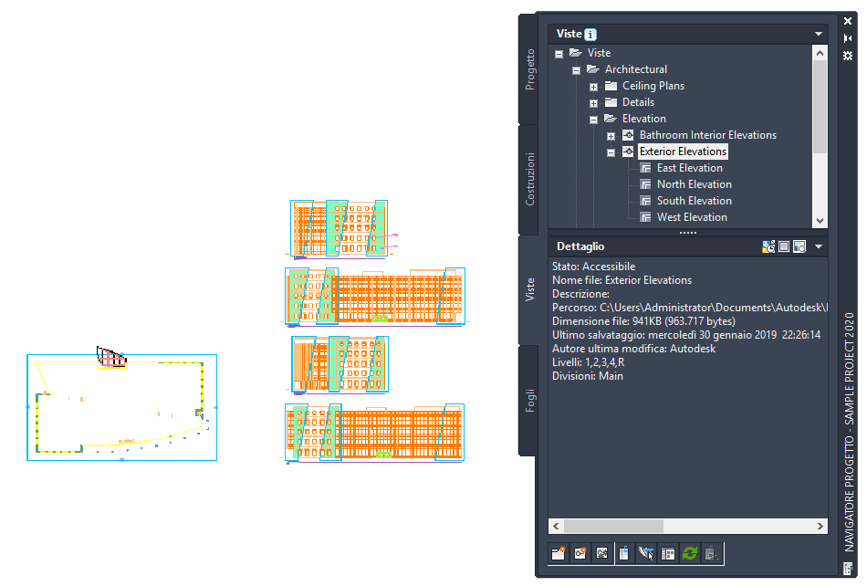 Un disegno della vista viene creato selezionando costruzioni nel Navigatore progetto e creando riferimenti ad esse nel disegno. Quando si creano viste a più livelli, il riferimento ad ogni costruzione viene stabilito in base all'altezza del livello relativa, con il livello più basso inserito all'altezza Z = 0.