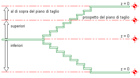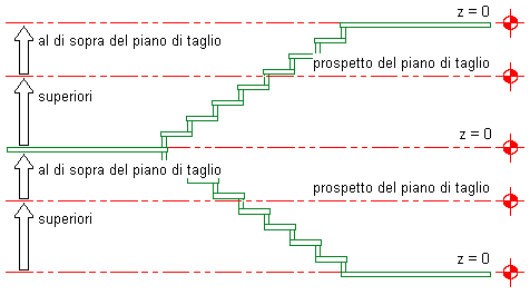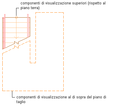 Sono disponibili componenti per il supporto della rappresentazione di componenti di scala al di sopra del prospetto del piano di taglio, pertanto gli elementi inferiori vengono utilizzati solo per visualizzare i componenti di scala al di sotto del livello corrente.