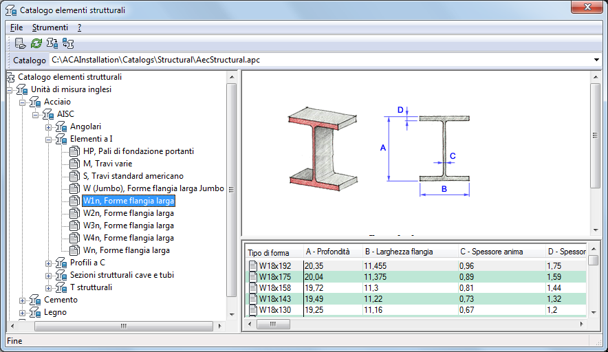Per creare gli stili della maggior parte delle travi, dei telai e delle colonne standard, è possibile utilizzare Catalogo elementi strutturali di AutoCAD Architecture toolset. Questo catalogo contiene le specifiche per le forme strutturali del legno, l'acciaio e il calcestruzzo di standard industriale organizzate in una vista struttura analoga a quella di Gestione risorse o Esplora risorse di Windows®. È possibile sfogliare il catalogo, selezionare una forma e creare uno stile.