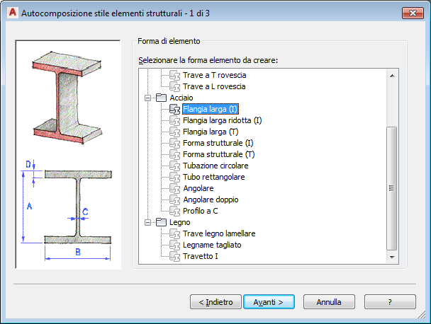 È possibile immettere rapidamente, se conosciuti, i dati relativi al tipo, alla forma e alle quote della forma da creare nell'Autocomposizione stile elementi strutturali. All'interno di uno stile, è possibile creare una forma dell'elemento strutturale basata su una delle forme di elemento presenti nel catalogo.