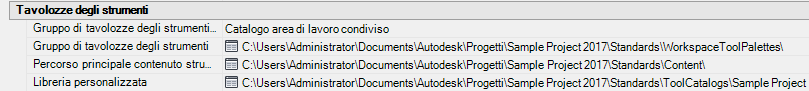 Selezionando Catalogo area di lavoro condiviso, il percorso selezionato in Gruppo di tavolozze degli strumenti viene aggiunto al profilo di progetto AWS dell'utente e il catalogo degli strumenti viene utilizzato da questo percorso. Se si seleziona Catalogo area di lavoro per utente, viene creata una cartella nel percorso C:\Documenti\Autodesk\Progetti\<nome progetto>\ in cui vengono copiate le tavolozze degli strumenti. Se si seleziona Nessuno, il gruppo delle tavolozze degli strumenti di progetto viene disattivato per il progetto e le altre proprietà in Tavolozze degli strumenti non vengono visualizzate.