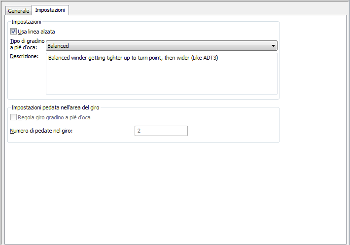| Far girare le pedate lungo tutta la lunghezza della scala | Selezionare Bilanciato per Tipo di gradino a piè d'oca. Nota: Questo tipo è utilizzato per tutte le scale con 1/2 e 1/4 di giro create con le versioni precedenti del programma.