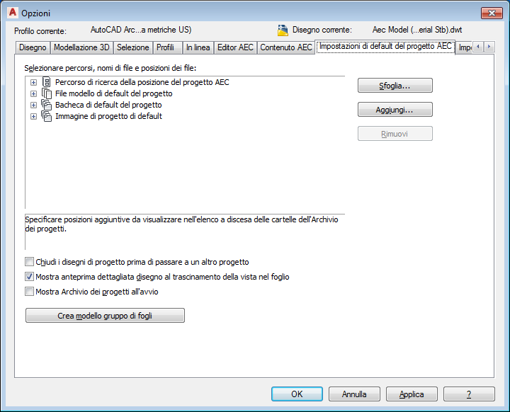 Per impostare le opzioni di default dei progetti AutoCAD Architecture toolset, attenersi a questa procedura. Di seguito vengono riportate le opzioni che è possibile impostare nei progetti:
