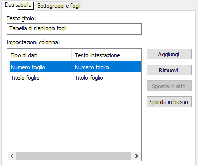 Consente di modificare il testo del titolo di ogni colonna della tabella di riepilogo fogli.