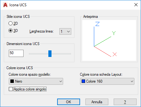Specifica la visualizzazione dell'icona UCS 2D o 3D e il relativo aspetto.