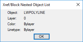 Se si seleziona l'oggetto, viene visualizzata la finestra di dialogo Xref/Block Nested Object List con le informazioni sulle proprietà visualizzate: