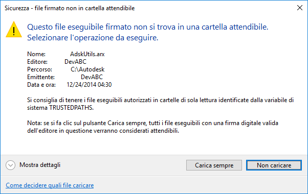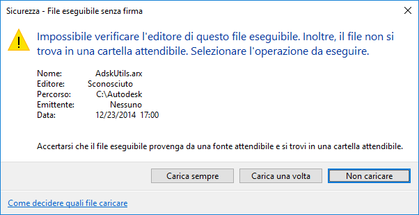 Durante il caricamento di un file di programma personalizzato con firma digitale, il programma basato su AutoCAD verifica la firma digitale allegata al file. Viene visualizzata una finestra di messaggio, se la firma digitale può essere verificata, che consente all'utente di caricare o meno il file di programma nell'ambiente di disegno.
