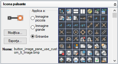Nel riquadro Icona pulsante, in Applica a, selezionare una delle tre opzioni di assegnazione dell'immagine: Immagine piccola, Immagine grande o Entrambe. Quindi selezionare l'icona da importare dall'elenco di immagini.