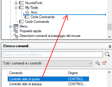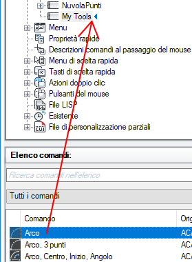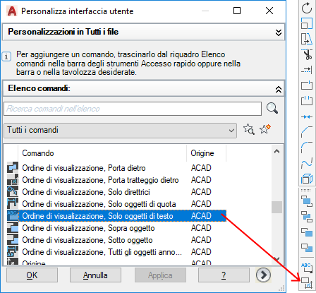 - Nel riquadro Elenco comandi, trascinare il comando da aggiungere alla barra degli strumenti nel riquadro Personalizzazioni in <nome file>.