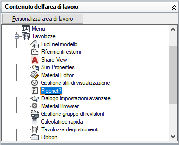 Nella scheda Personalizza, nel riquadro Personalizzazioni in <nome file>, espandere Aree di lavoro e selezionare l'area di lavoro contenente la tavolozza che si desidera modificare.